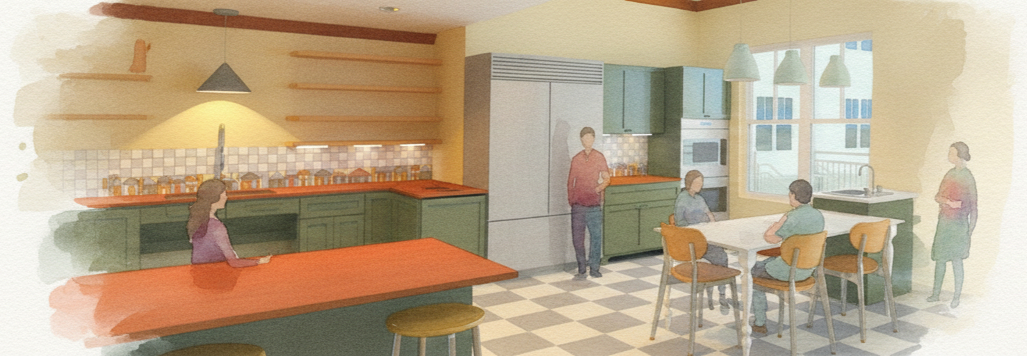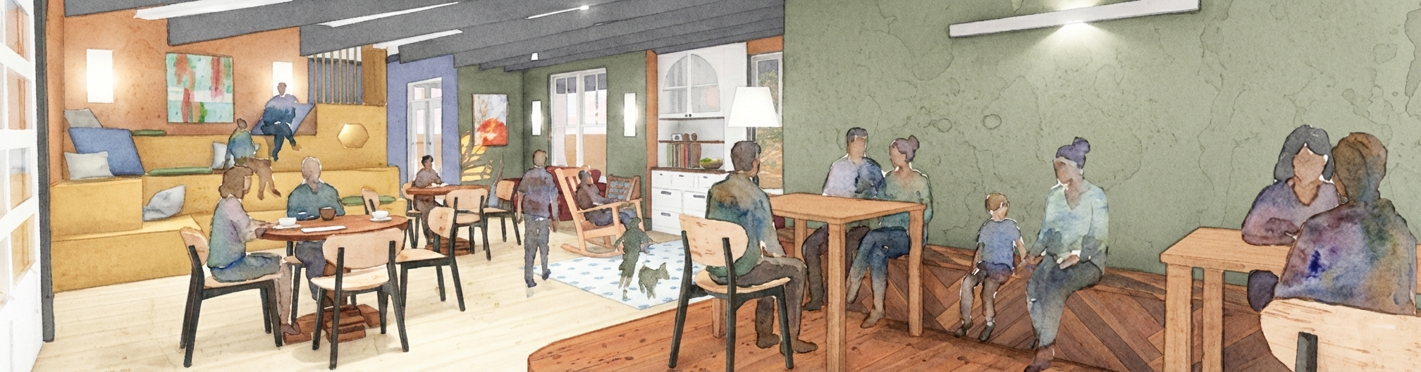 Branded as the “Common Threads” building, my plan for the expansion of a local intergenerational housing community carried the concept of “Follow Me” throughout. My goal was to create a space that allows individuals to share their stories and knowledge, while recognizing the interwoven nature of the lives of residents, regardless of age. Playful furniture and design elements can be seen in many spaces, while acoustic baffles with a bounding ribbon occupying the hallway help with wayfinding.