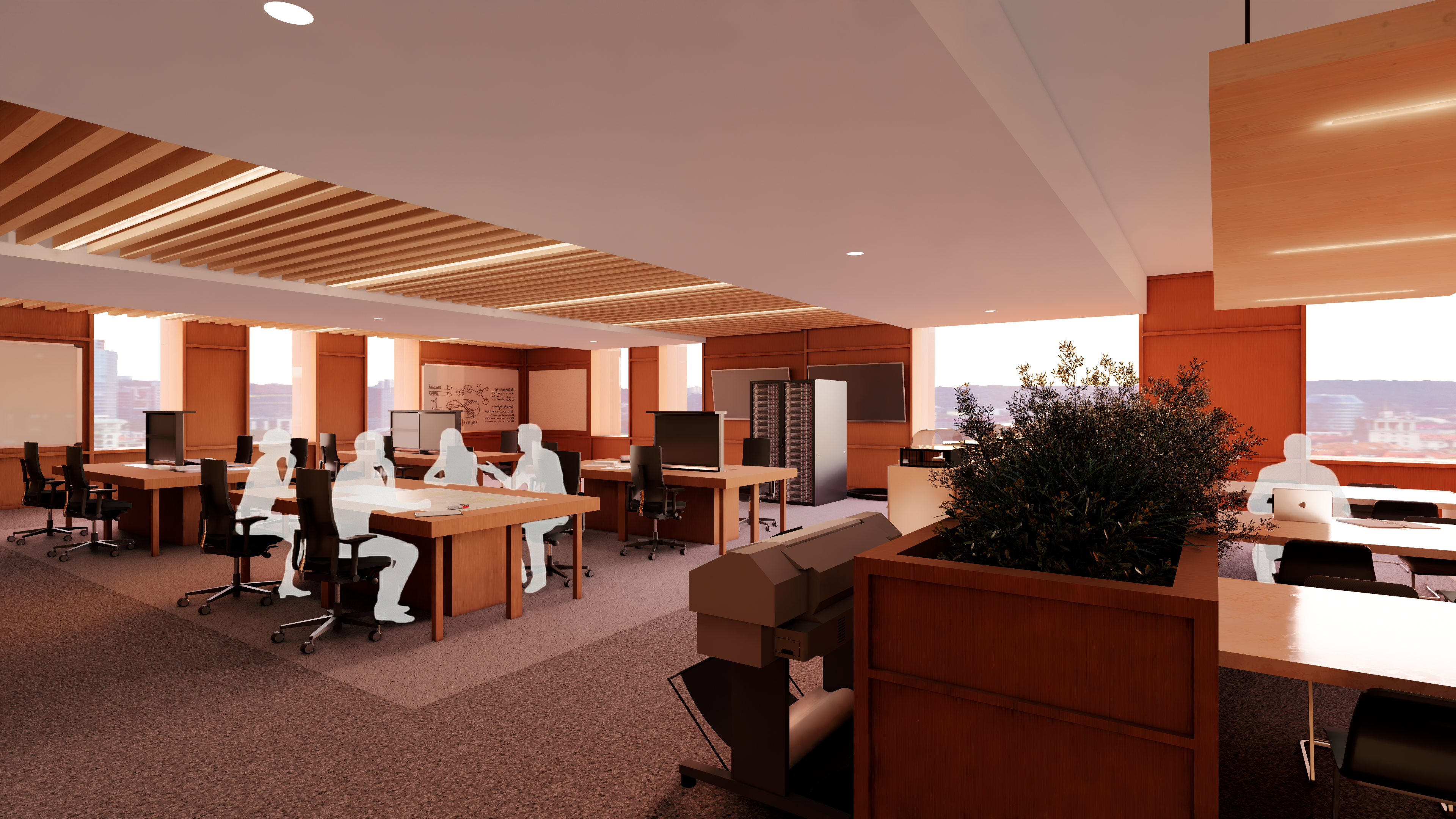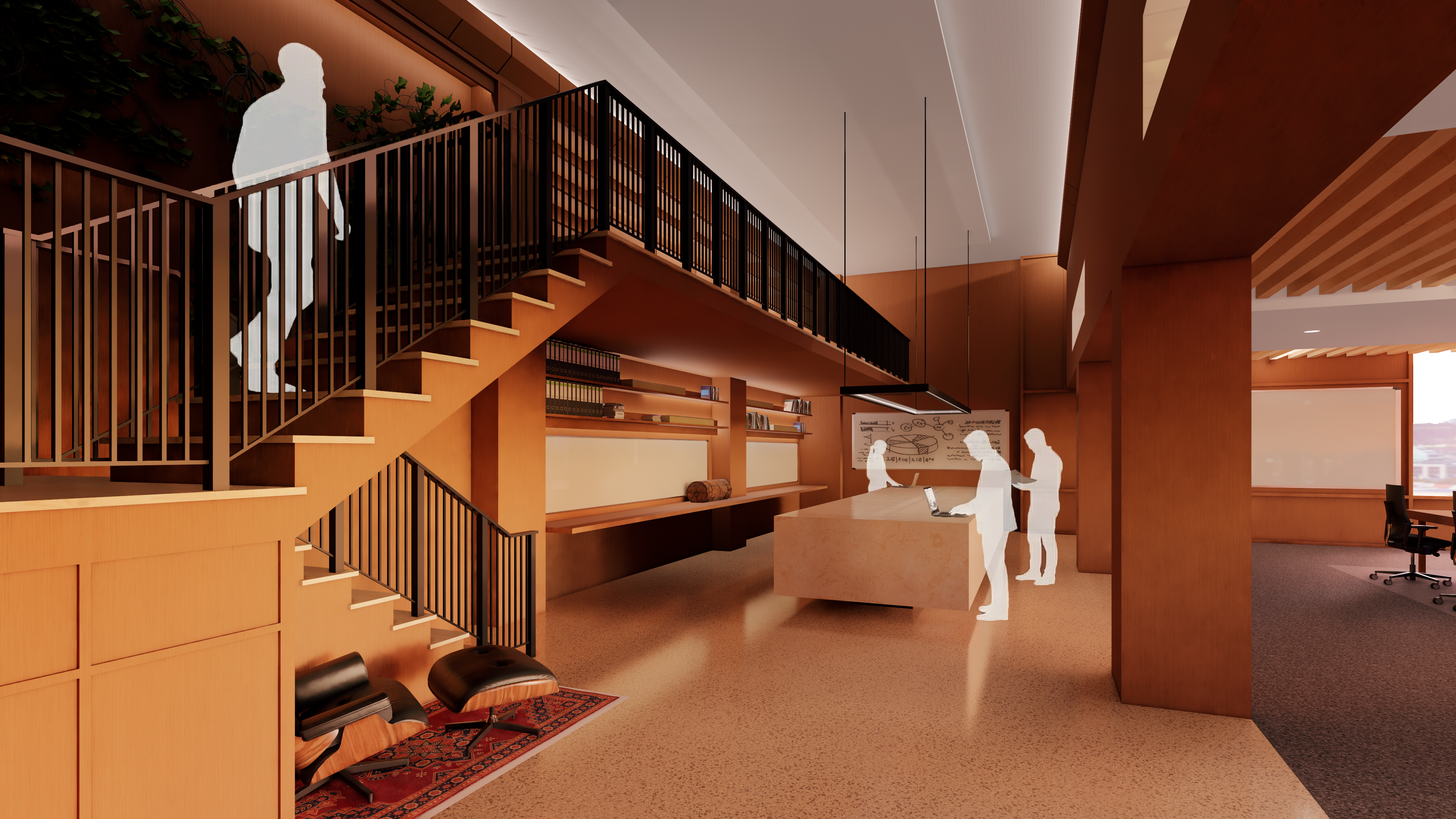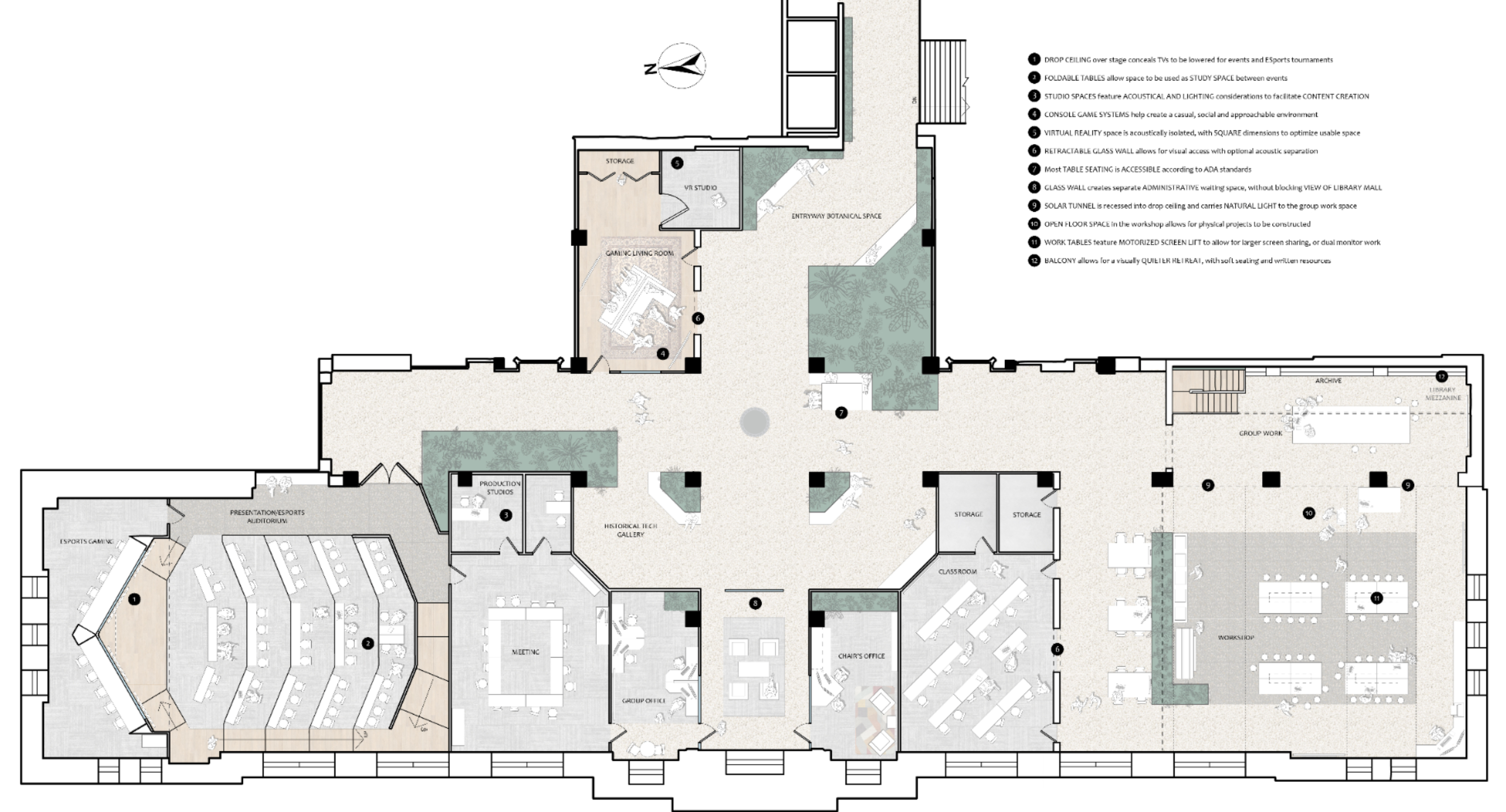 Our design studio cohort was recruited to propose ideas for the University of Wisconsin’s 16,000 SF remodel of the 2nd floor of the Memorial Library. The client asked for a research, work, and event space that welcomes and serves all members of the UW campus working with current technology, and years into the future. After just 5 weeks of work, my teammate and I propose a vision for the space that is future forward, but grounded in the familiar. Digital technology has a foundation in the analog world, and is shaped by the humans who interact with it. Because of this, our design seeks to draw on natural elements and materials that ground us in the physical world, while organizing the entire design in a way that makes it versatile and moldable to changing programmatic requirements.