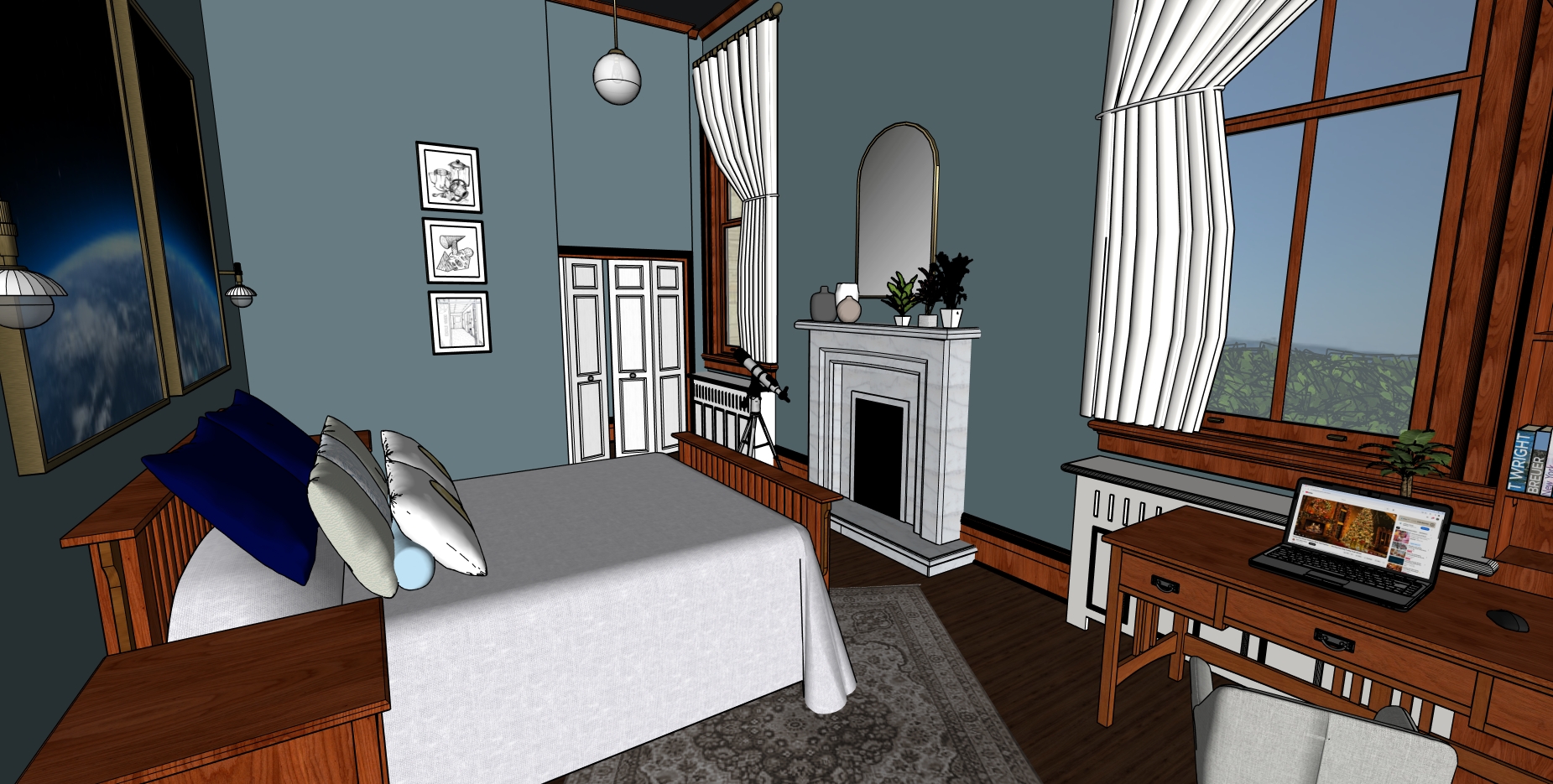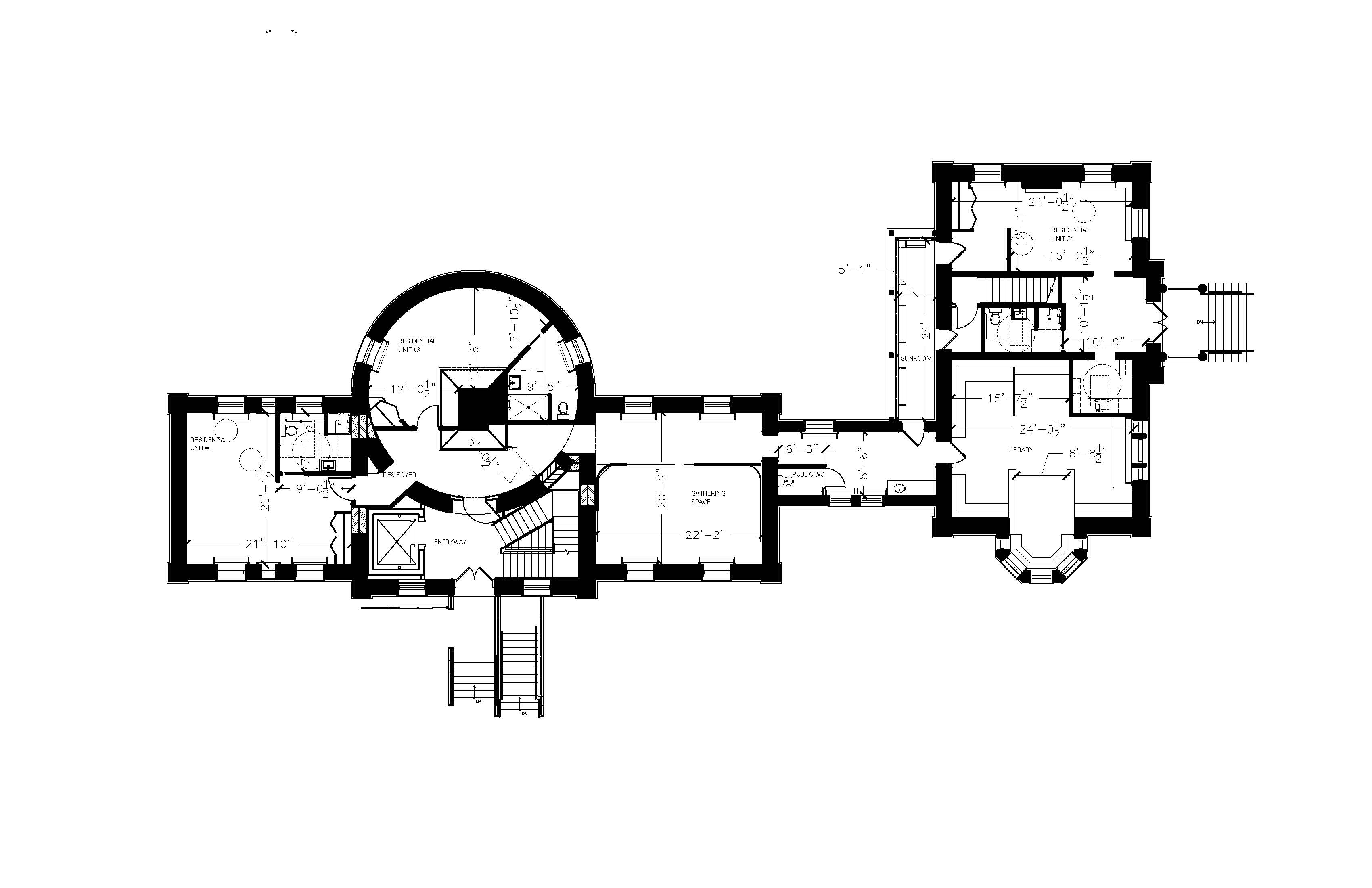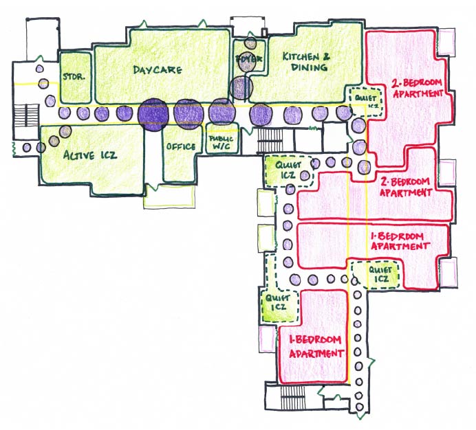 Factoring in the historical site and building, as well as the client’s requirements, my design became centered on the verticality of the spaces, as they relate to the human fascination with celestial happenings. The building is made approachable and applicable to various stakeholders on the UW campus, while still affording privacy and territoriality to those staying in the long and short term units.