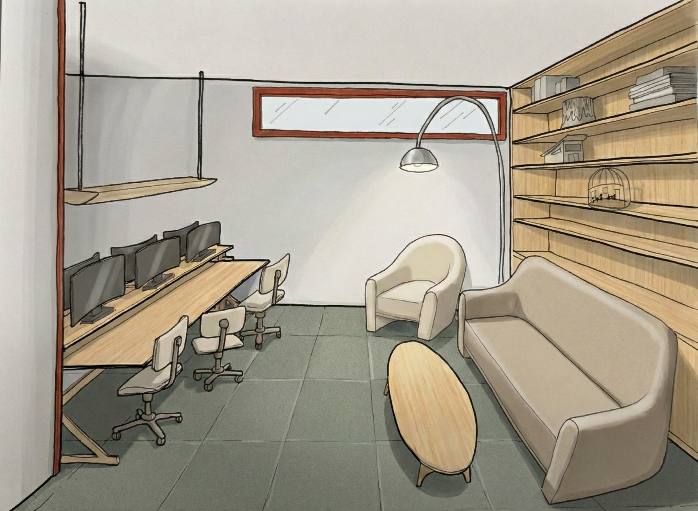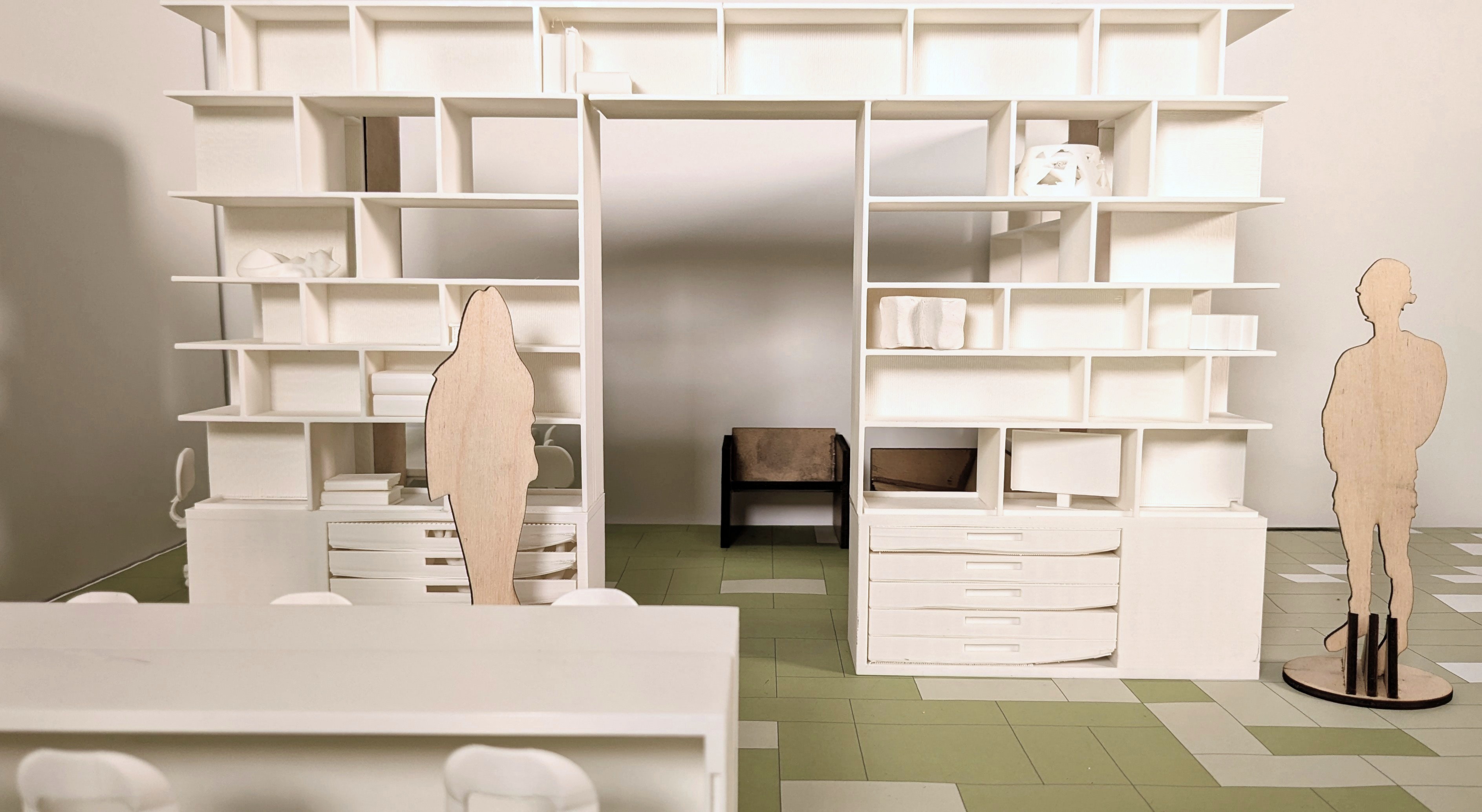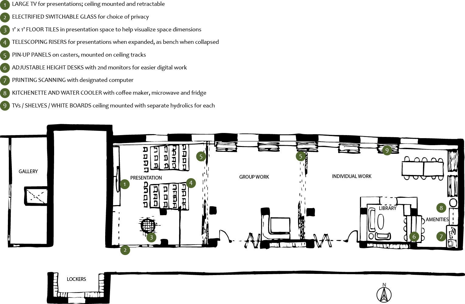 For a space created by and for designers, the current Interior Architecture Studio in the School of Human Ecology at UW-Madison does not inspire or fully support the work of the students who utilize it. From floor plan to amenities, the current design lacks functionality. But beyond that the space lacks personality to draw people in, and help students take ownership in their education. Teamed up with another student, the studio is re-imagined to maximize its potential, and thoroughly explored our proposed interventions with custom-designed furniture, 3D printed models, and hand drawings.